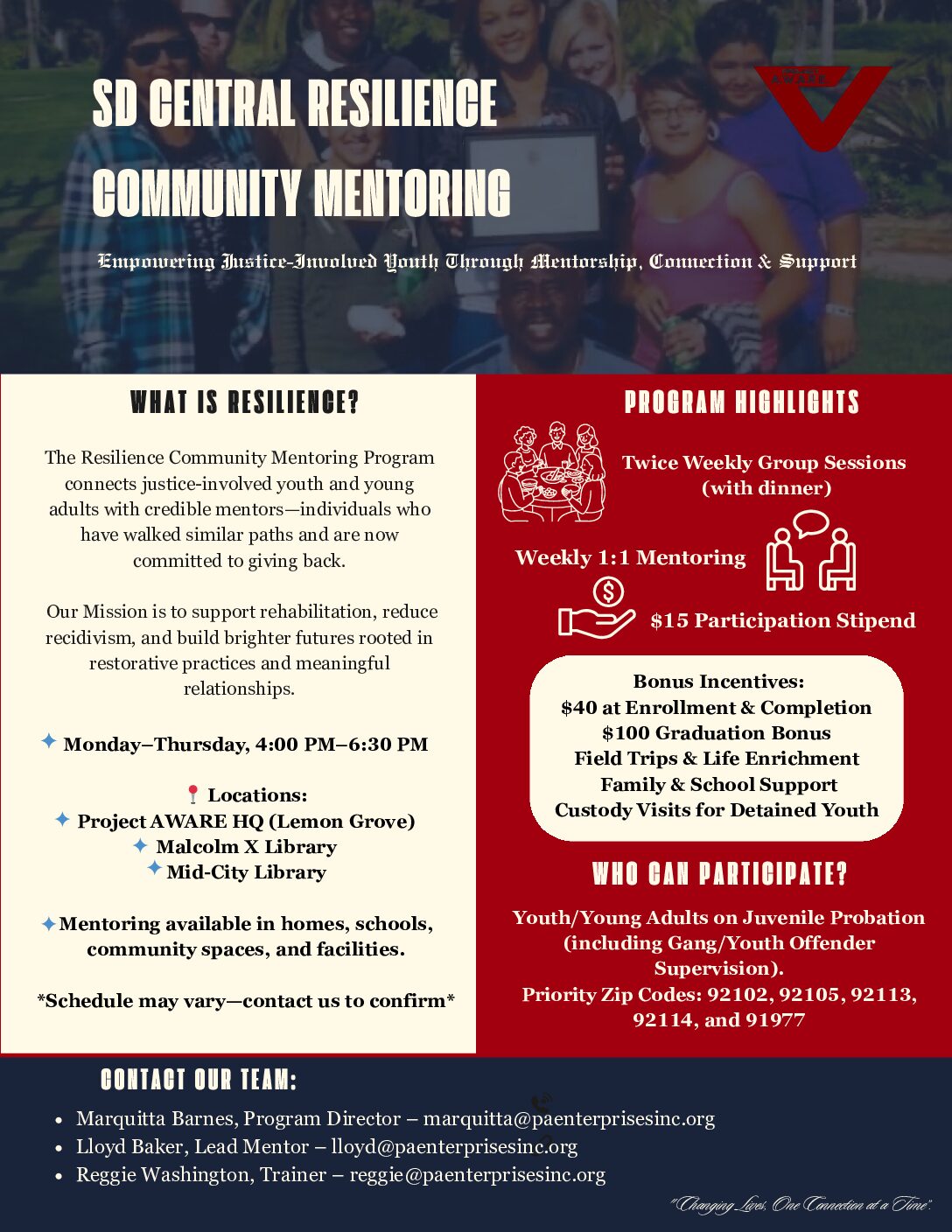 As a young man, Reginald Washington found himself involved with gangs with no awareness of alternative ways to deal with his anger. He founded Project AWARE to teach young people the emotional literacy skills he wish he had back then. Experienced and Certified Mr. Washington is a certified trainer in Restorative Practices and a certified Community Mentor, with over a decade of experience working with youth in San Diego County. He has been trained by recognized agencies such as the National Institute of Corrections, San Diego County District Attorney’s Office, US Attorney’s Office, and the National Conflict Resolution Center, among others Recognized and Trusted Reginald has been recognized by the San Diego County Sherriffs Department for his contributions to their Youth Academy, and by the California Crime Prevention Officers Association for promoting public safety.
